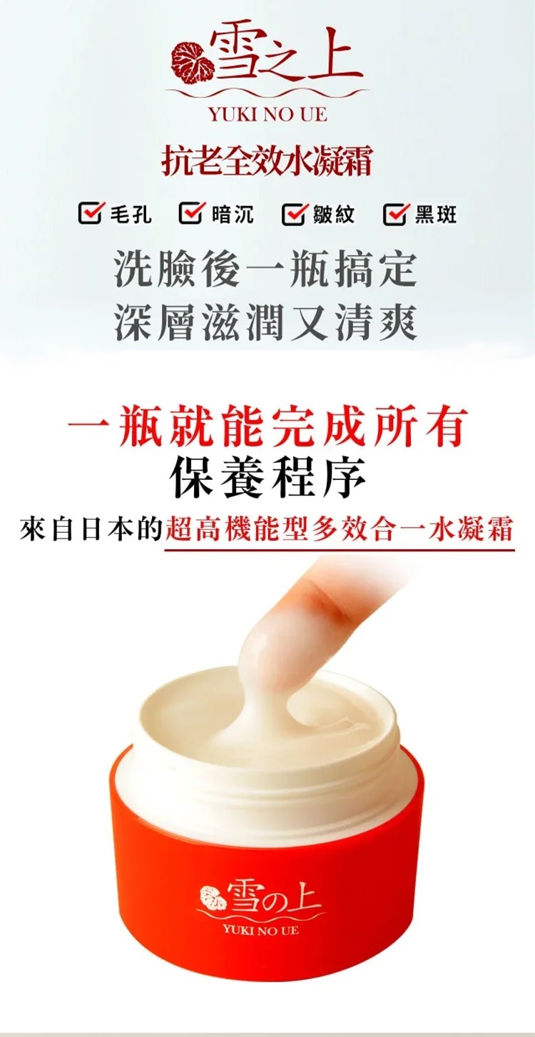 半小時前【品牌限時優惠】港澳台熱銷到斷貨【原廠正品】雪之上(YUKINOUE) 全效合一水凝霜【80g/瓶】日夜修復 化妝水+精華液+乳霜 多效合一All in ONE! 一瓶到底 輕鬆保養 *維持美肌原生力*深層浸潤、導入精華、鎖住水潤 - 【買一送一】 雪之上水凝霜(80g X 2入瓶裝)- 僅需 NT$ 998